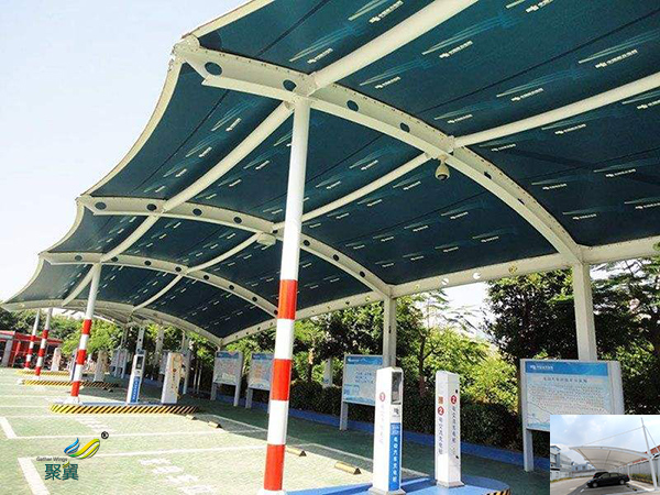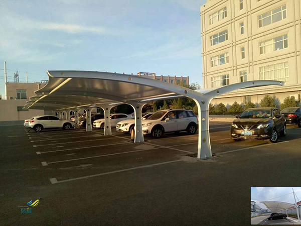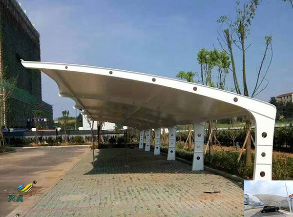 膜結(jié)構(gòu)車棚的篷布材質(zhì)是膜結(jié)構(gòu),而膜材的最大特點(diǎn)是強(qiáng)度高、耐久性好、防火難燃、自潔性好,不受紫外線影響,使用壽命長(zhǎng),一般15-30年。具有高透光率,透光率為13%,對(duì)熱能反射率73%,熱吸收量很少。正是因?yàn)檫@種劃時(shí)代的膜材料的發(fā)明,使膜結(jié)構(gòu)車棚成為現(xiàn)代化的永久建筑。鑒與此,膜結(jié)構(gòu)造型的停車棚在停車場(chǎng)建設(shè)中也以其優(yōu)美的造型和實(shí)在的功能擔(dān)當(dāng)重要角色,是您的愛車最佳安身之所。