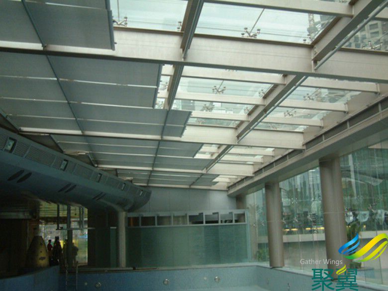 玻璃幕墻頂面遮陽棚:有室內(nèi)遮陽天棚(圖1),和室外遮陽天棚(圖2)