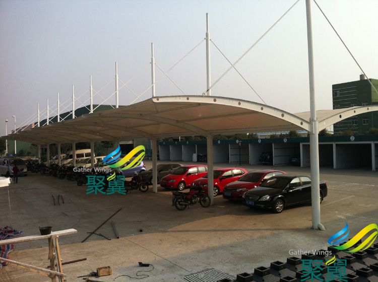 JY-20車棚主體采用加強型鋼結構,鋼結構專用底面油漆。車棚面料采聚翼PVC膜布材質保8年,自潔性能好,我司自主生產PVC膜布材料其表面無靜電,對灰塵沒有吸附力,易清洗。從而使得膜結構建筑保持表面亮麗潔白,室外使用壽命約為10年。