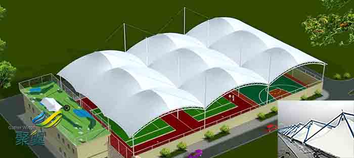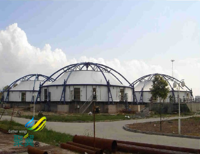 污水池蓋也叫污水池罩、臭氣收集罩。是一種新型的大跨度空間結(jié)構(gòu),越來越受到用戶的喜愛和使用,污水池加蓋是由具有優(yōu)良性能的織物(膜材)通過支撐構(gòu)件(如剛性梁、柱、柔性索),或給膜內(nèi)空氣加壓以一定的方式組合并施加適當(dāng)?shù)某跏碱A(yù)張力而形成具有一定剛度的空間結(jié)構(gòu)形狀,從而承受一定外荷載的一種空間結(jié)構(gòu)形式。而膜材料是大跨度空間結(jié)構(gòu)最重要的組成部分,被稱為“第五代建材”。具有耐腐阻燃,堅(jiān)固防滑、質(zhì)量輕、易安裝、免維護(hù)、絕緣等優(yōu)異特性。