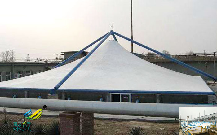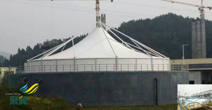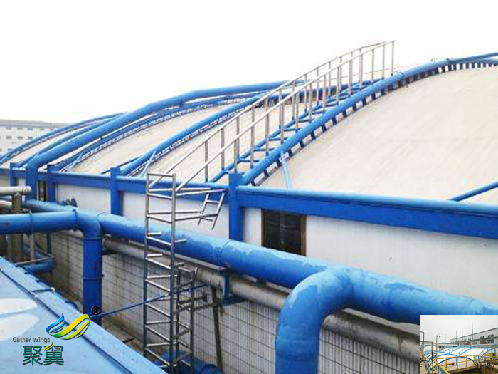 3.污水池加蓋具有高強度低紗聚酯絲;這種特性很好的保證了膜材的抗拉性能,不容易被撕裂,而且耐磨損,氣密性好等特點。