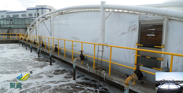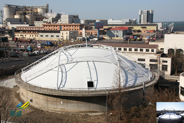 污水池加蓋是一種專門針對污水池廢氣收集的處理方法。這種方法將廢氣密封在一個密閉的空間,四周用鋼架支撐,用抗腐蝕性能高的膜材作為池體的蓋板,氣密性達到100%。通過池體廢氣除臭裝置對廢氣的收集,凈化等操作,然后將達標的廢氣排出池外。