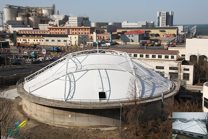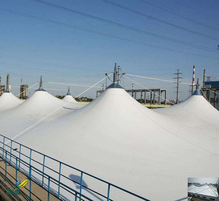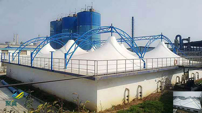 2、污水池加蓋防腐效果好;由于膜材料結(jié)構(gòu)建筑的特殊性,可將鋼架設(shè)在外面,只有膜材料結(jié)構(gòu)接觸污水池,基本解決腐蝕問題,而且將來也不用考慮保養(yǎng)問題。
