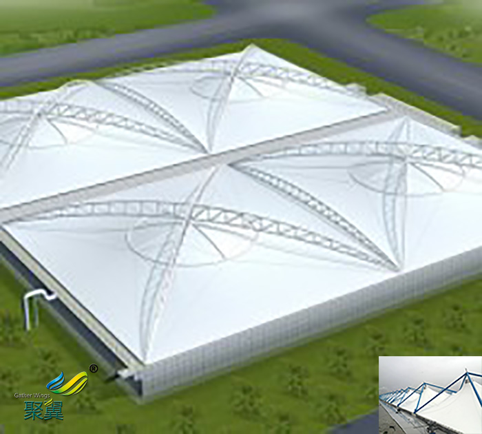 污水池加蓋膜方式,就是采用反吊膜結構,將鋼結構在外將膜材反吊,污水池四周用反吊膜緊密包裹起來,四周用鋼架支撐,防止廢氣跑出池外對環境造成影響。污水池加蓋膜結構是一種新穎的污水池除臭手段,可以從根本上避免池內廢氣對鋼架的腐蝕,是一種理想的除臭方法。而且,這種反吊膜結構加蓋的方式,所用的膜材是一種含特殊性質的材料,由基布和涂層兩部分組成,這種膜材不僅抗腐蝕能力強,而且抗拉性能好,膜層經過pvc改造后,表面具有很強的抗污染能力,延長了膜材的使用壽命,減少了后期的維修工作。