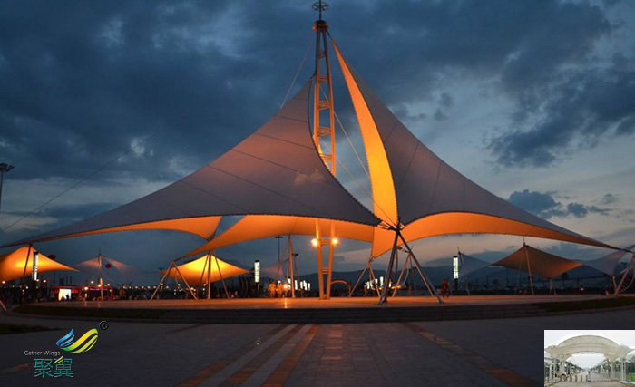 1、景觀膜結構能夠覆蓋大跨度空間,因為重量輕,膜結構中利用的薄膜材料,每平方米重量只要一公斤。加上鋼索,鋼結構高強度材料的采取,使膜結構跨度大空間,構成開放的無柱大跨度結構體系