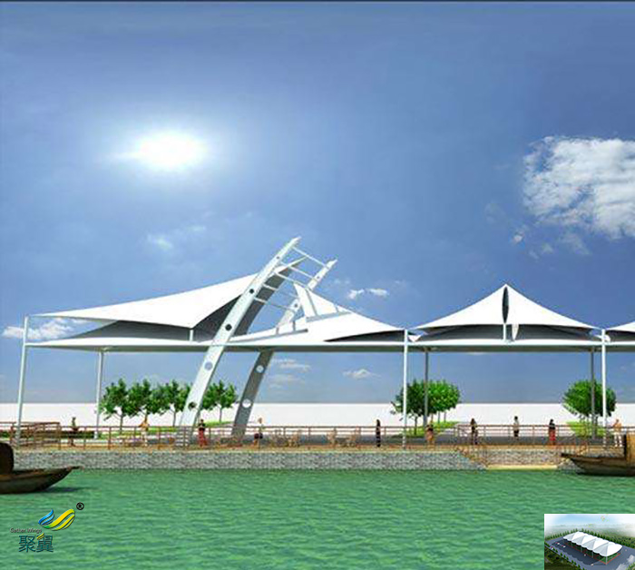2、景觀膜結構具有杰出的透光性和自潔,膜材的透光性及對光色的選擇可以通過涂層的顏色或是面層顏色來調節。通過膜材和透光保溫材料的適當組合,可以使含保溫層的多層膜具有透光性。即使光譜透射只有幾個百分點,膜屋面對于人眼來說依然是發亮和透光的,具有輕型屋面的觀感,常用建筑膜材的外觀為PVDF資料涂層,存在物理服從動搖與良好的自潔效果,膜外觀粉塵一般環境下雨水可自行沖洗干凈,同時包管建筑的使用壽命。