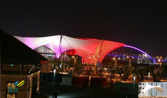 4. 景觀效應(yīng)性:新穎別致的膜建筑造型既突顯個(gè)性與華麗,又能適時(shí)適地融合周邊景致,相得益彰。夜間通過燈光調(diào)控,成為一道亮麗風(fēng)景線。
