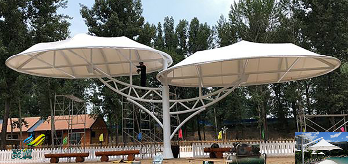 膜結構傘,就是以材料做為頂棚材料的遮陽設備,由于其形狀類似傘狀,因此得名。膜結構傘擁有價格實惠,造型別致,質量優秀,保質期長等特點,所以深受廣大客戶的喜愛。也正是因為這些特點,使得膜結構傘經常應用到建筑入口、步行街、小區花園、旅游景點等環境。