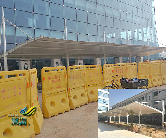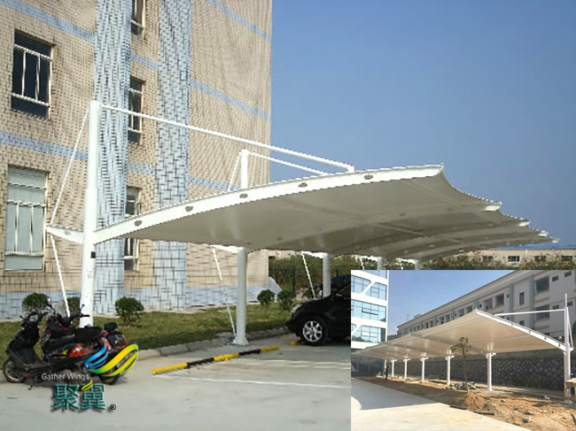 膜結構車棚懸掛臂的安裝與焊接:懸掛臂的安裝采用焊接。需要對焊接接頭進行檢查,調整懸掛臂設計坡度,以便準確正確地進行焊接。一個懸掛臂正確后,安裝另一個懸掛臂,精確定位后進行點焊。然后,基于兩個懸掛臂,繪制出懸架臂的高標高線和低標高線,并將剩余的懸架臂逐一膜結構車棚焊接。