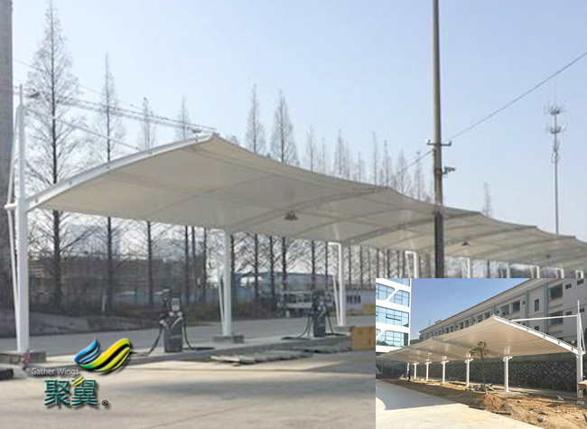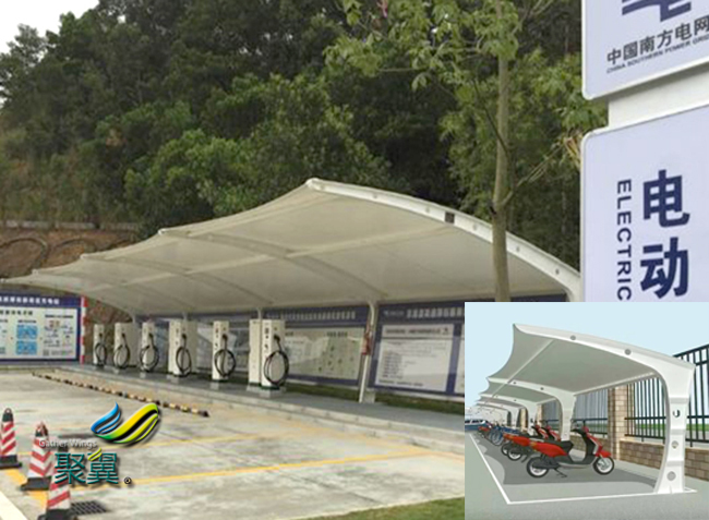 膜結構車棚自行車棚所選用的膜材具有卓越的阻燃性和耐高溫性,故能很好的滿意防火請求。因為膜結構車棚構造自重輕,又為柔性構造且有較大變形才能,故抗震性能好。拼合成型及骨架的鋼構造、鋼索均在工廠加工制造,現場只需拼裝,施工簡潔,故施工周期比傳統修建短。