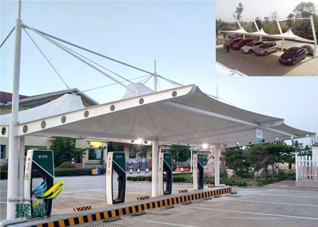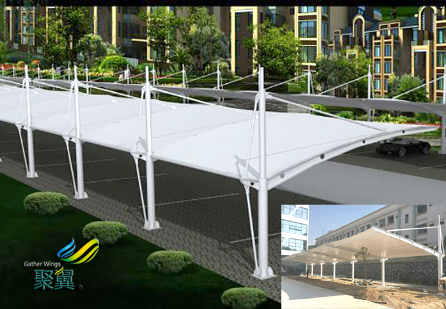 膜結(jié)構(gòu)車棚自行車棚不只具有美麗的外觀、特性的外型并且其功用也對比突出,膜結(jié)構(gòu)車棚是城市綠色化建造的一大輔佐。