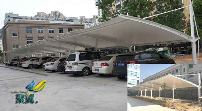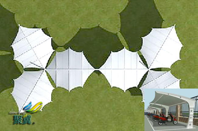 膜結構車棚最值得一提的是膜結構車棚可以根據支撐構件的位置和高低排列組成不同的形狀,這在金屬膜結構車棚上是無法想象的。所以膜結構車棚可以通過自身柔美的曲線和周圍的藝術景觀結合起來,給人以美的享受。