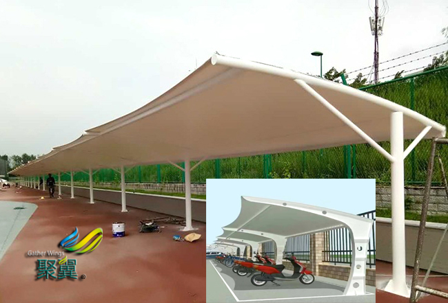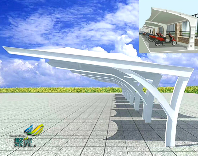 膜結構車棚是一座雕塑,一件藝術品,給人美的視覺享受。其柔美,其曲線,膜結構車棚剛柔并濟,其豐富造型,其潔白無瑕,讓人眼前一亮,回味悠長。輕便性:重量輕,絕對保證棚下人和物的安全。但由于荷載作用下膜結構材料會產生變形,膜結構車棚膜面坡度較小處可能會有積水。
