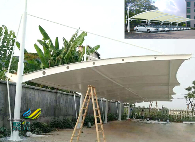 每臺機器的膜結構車棚焊接參數設置應通過焊縫測試來確定,并在該工程的制作加工過程中保持不變。為此,侮班作業前應該完成質量控制測試并對結果加以分析。 當膜結構車棚工程或使用的材料發生變化時,應重新進行測試。應將測試結果和參數予以記錄。在加工之前,必須對每一膜結構車棚膜片條元做出正確的標記以表明哪一面朝上。
