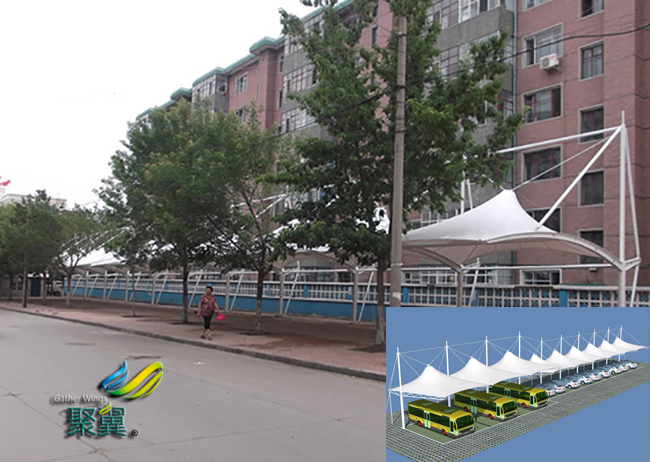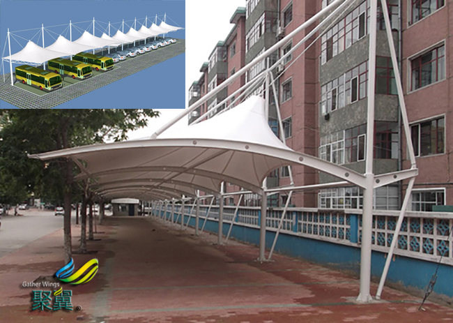 膜結構車棚的新型建筑結構類型,這種建筑與結構結合的體系應用的是高強度的柔性薄膜材料與輔助結構,膜結構車棚材料和輔助之間通過一定方式使膜結構車棚內部產生張力,在形成的力的控制下形成某種空間形狀,作為覆蓋結構或者建筑物主體,這種窄間結構類型具有足夠剛度來抵抗外部荷載作用。