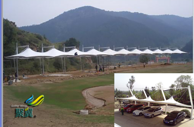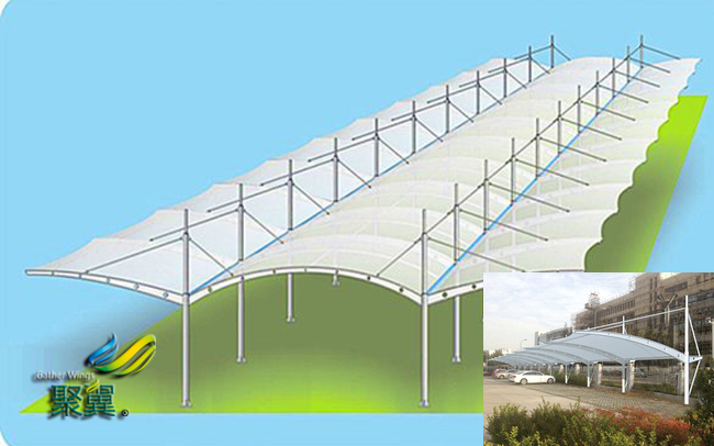 我們都知道張拉膜膜結構車棚是鋼索從邊上穿過,拉出幾個角并固定在不同的高度之上,會形成高低落差,這樣的落差看起來是很美妙的,相對的展開面積就會大很多,因為在占地面積的陰影中,實際很多是重疊不垂直的。