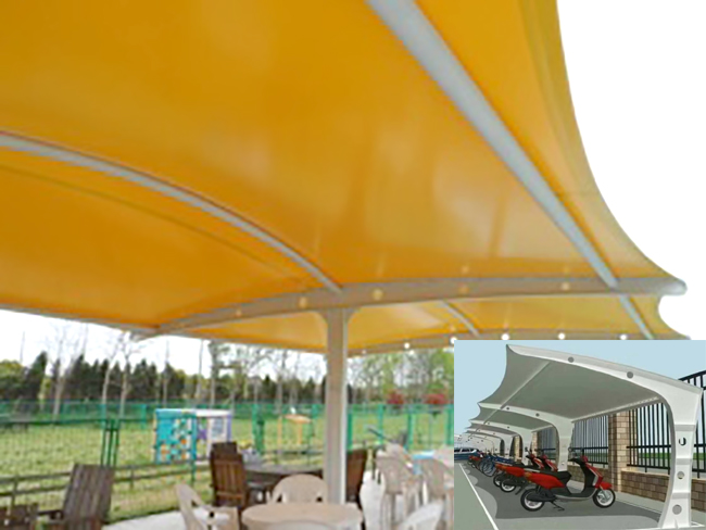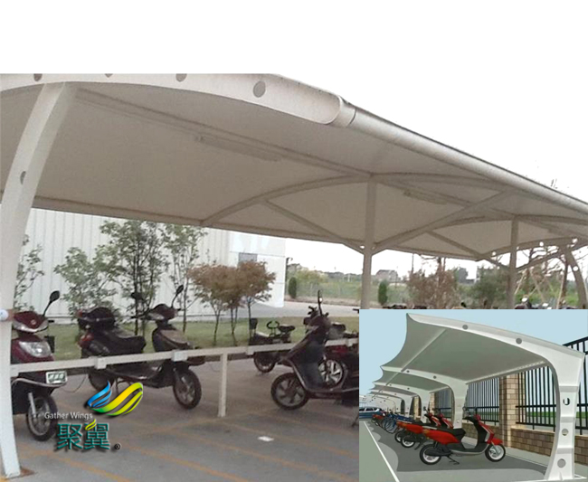 膜結構停車棚是依靠膜自身的張拉應力與支撐桿和拉索共同構成機構體系。在陽光的照射下,由膜結構停車棚膜覆蓋的建筑物內部充滿自然漫射光,無強反差的著光面與陰影的區分,棚內的空間視覺環境開闊和諧。