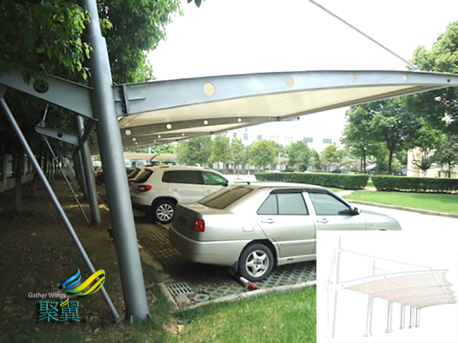 根據結構形式的不同,膜結構車棚結構可分為3類:骨架式膜結構、張拉式膜結構。骨架式膜結構是在鋼架或其他材料的骨架上鋪裝膜材料,由此構成膜結構車棚棚頂或外墻壁的構造形式。