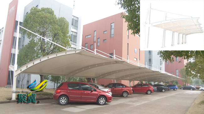 膜結構車棚是一種公用建筑物,是由建設單位出資進行修建,所以這種產品的首要要求就是耐用穩固,金屬車棚都是金屬支撐柱,然后其上進行焊接等工藝加裝頂棚。如果是采用的聚碳酸酯材料作為頂棚的話,采用螺栓固定。相對于膜結構車棚來說,整體能承受的載荷會小很多,遇到劇烈的暴風雨天氣,頂棚會和支撐件分離。而膜結構車棚受力點小,單位尺寸上能承受的壓強高,因此在多次的實踐中,膜結構車棚都穩固如山。
