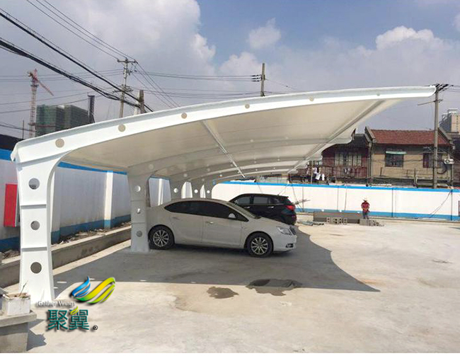 膜結構車棚的優點是強度高、耐用、防火難燃、高自潔性、不受紫外線影響,膜結構車棚使用壽命長,透光性好、熱量吸收少等特點,正是因為膜結構車棚膜材料這一發明具有這么多的特點,因而膜結構車棚這一建筑成為了我們身邊越來越不可或缺的建筑。