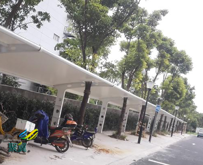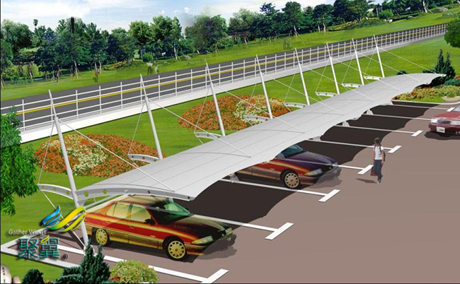 膜結構車棚除了藝術性和獨特性之外,膜結構車棚的實用性也不得不提,這歸功于膜結構車棚的材料的特殊性,膜結構車棚的主要材質是膜材,同時作為遮蓋結構,膜結構車棚膜材的張力使其能承擔一定的外荷,最有趣的是,即使出現不可負重的現象,由于膜材質本身比較輕巧,也不會帶來太多的傷害。