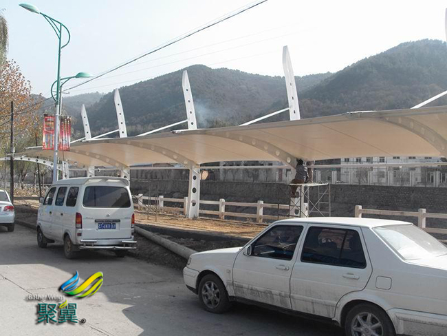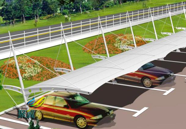 膜結構車棚柔美,其曲線,其剛柔并濟,其豐厚造型,膜結構車棚潔白無瑕,讓人眼前一亮,回味悠長。 膜結構車棚膜構造中所使用的膜資料每平方壹公斤左右,因為自重輕,加上鋼索、鋼構造高強度資料的選用,與受力系統簡練合理——力大部分以軸力傳遞,故使膜結構車棚膜構造合適跨越大空間而構成開闊的無柱大跨度構造系統。