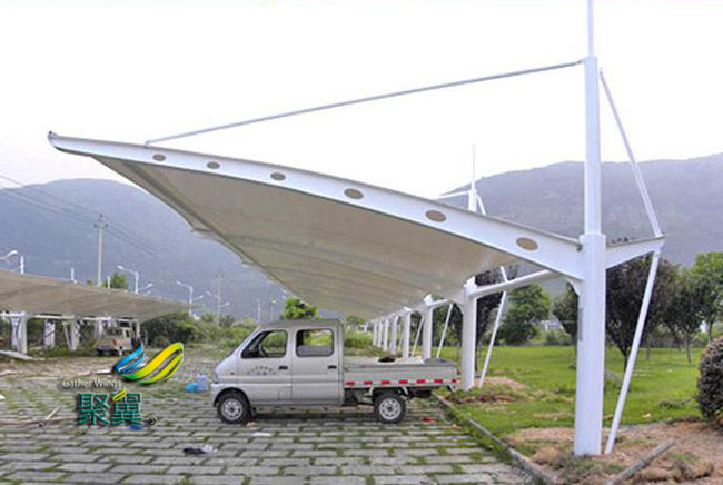 膜結構車棚防污自潔性是所有建筑膜材中最好的,但柔韌性差,施工較困難,成本也十分驚人。膜結構車棚其加工方法是把玻纖織物多次快速放入特氟隆熔體中,使織物兩面皆有均勻的特氟隆涂層,使永久性的膜結構車棚正式誕生。