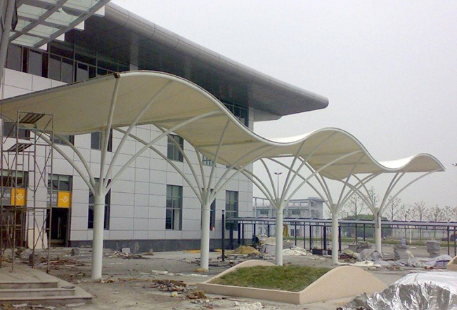 對膜結(jié)構(gòu)車棚的形狀設(shè)計(jì)、荷載分析、裁剪設(shè)計(jì),應(yīng)在考慮施工過程的基礎(chǔ)上進(jìn)行一體化的設(shè)計(jì)。