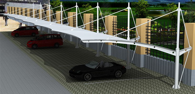 膜結構車棚最值得一提的是膜結構車棚可以根據支撐構件的位置和高低排列組成不同的形狀,這在金屬膜結構車棚上是無法想象的。