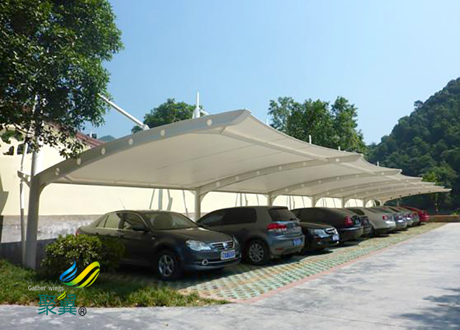 膜結構車棚PVC材料的主要特點是強度低、彈性大、易老化、徐變大、自潔性差,但膜結構車棚價格便宜,容易加工制作,色彩豐富,抗折疊性能好。