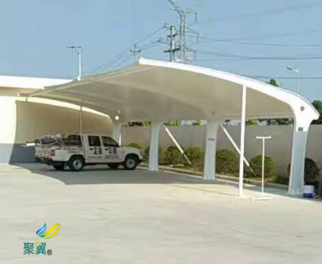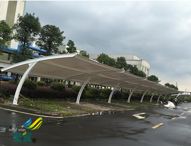 膜結構車棚耐用:由于高強度的膜材出現,再加上張拉技術的應用,使膜結構車棚抵御風雨的能力是一般雨蓬之類不可比擬的。有的車棚采用永久性膜材,可使用三、四十年。