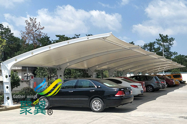 膜結構車棚的篷布材質是膜結構,而膜結構車棚膜材的*大特點是強度高、耐久性好、防火難燃、自潔性好,不受紫外線影響,膜結構車棚使用壽命長,一般15-30年。