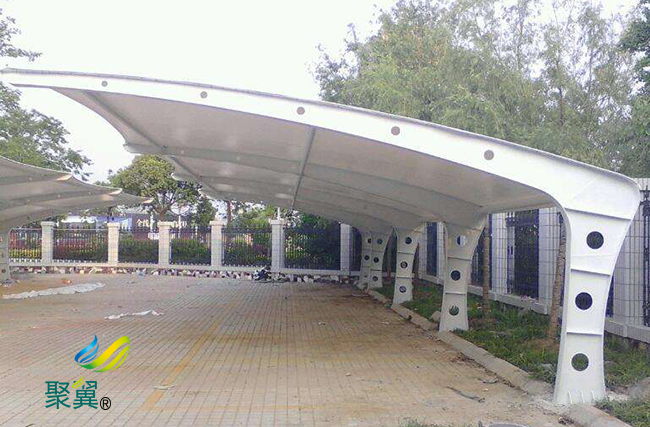 膜結構車棚耐用:由于高強度的膜材出現,再加上張拉技術的應用,使膜結構車棚抵御風雨的能力是一般雨蓬之類不可比擬的,有的膜結構車棚采用永久性膜材,可使用三、四十年。