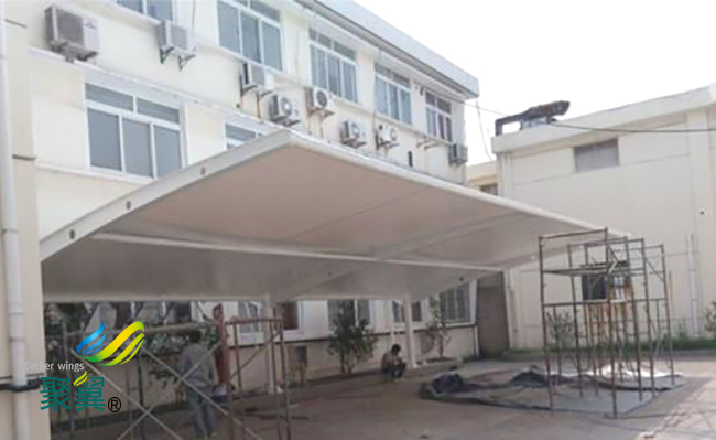膜結(jié)構(gòu)車棚面層,保護(hù)基材免受紫外線侵蝕并使膜結(jié)構(gòu)車棚膜材具有自潔性的表面附加涂層。膜結(jié)構(gòu)車棚預(yù)張力,以機(jī)械或其他方法,預(yù)先施加于拉索或膜片上的力。