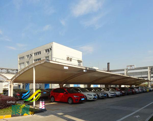 膜結構車棚PVc膜材料的自潔性,特別是在表面粘貼PVF薄膜(氟化乙烯)能大大改善膜結構車棚膜材料的自清性及抗老化性。