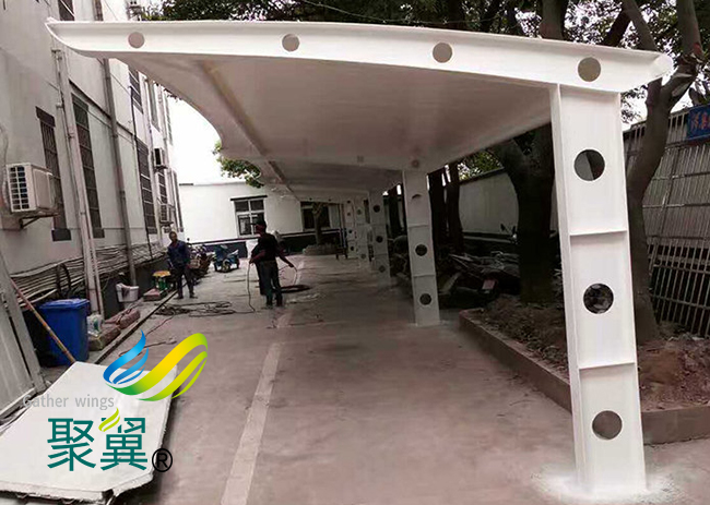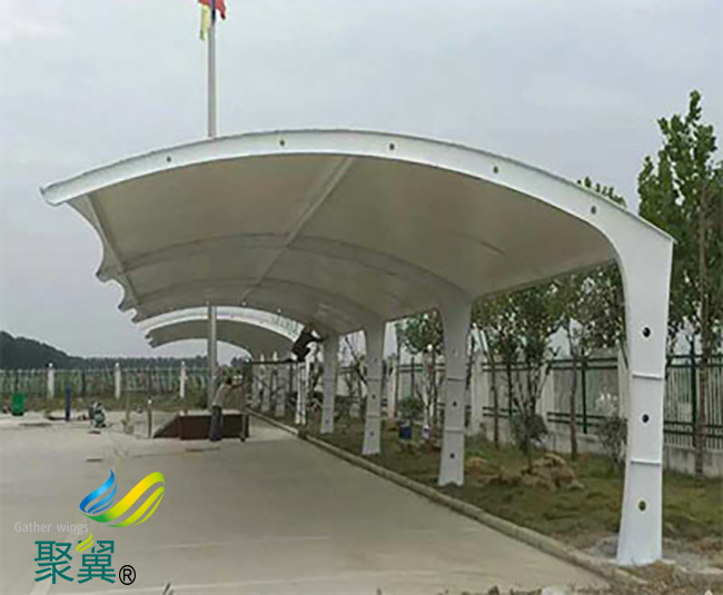 膜結構車棚膜材、鋼索及支柱構成,使用鋼索與支柱在膜材中導入張力以達安定的方式。除了可實踐具構思,立異且美觀的造型外,也是最能展現(xiàn)膜結構車棚精力的結構方式。