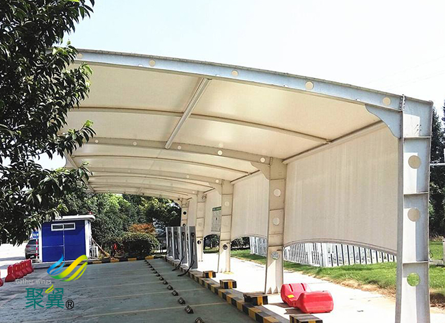 膜結構車棚自行車棚這種戶外的設施要有一定的抗風性,像這種膜結構車棚膜材也十分能適應這種環境,通過試驗發現,像這種膜結構車棚膜材的抗風能力*高達到十一級。