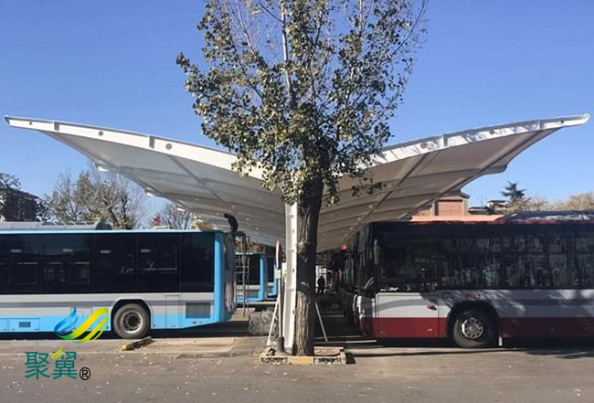膜結構車棚膜材的支撐結構受力更小,支撐材料更簡便,結構顯得輕盈美觀大方。膜結構車棚膜材韌性高、耐腐蝕性強、強度高的特點,簡直就是環保領域應用材料的絕佳選擇。