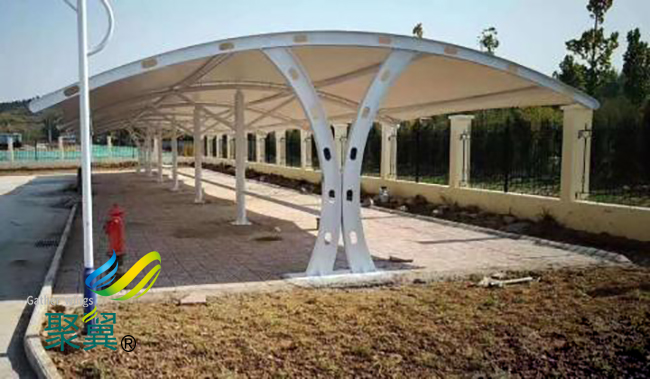 膜結構車棚的連接構造設計應考慮結構的形狀、荷載、制造、安裝等條件,使結構可靠、確保力的傳遞,并能適應可能的位移和轉動。