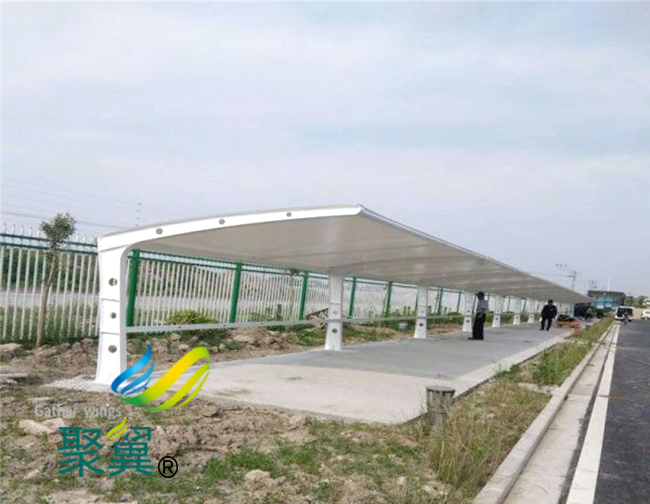 覆蓋大跨度空間, 膜結構車棚中所使用的膜材料每平方壹公斤左右,由于自重輕,加上鋼索、鋼結構高強度材料的采用,與受力體系簡潔合理——力大部分以軸力傳遞,故使 膜結構車棚適合跨越大空間而形成開闊的無柱大跨度結構體系。