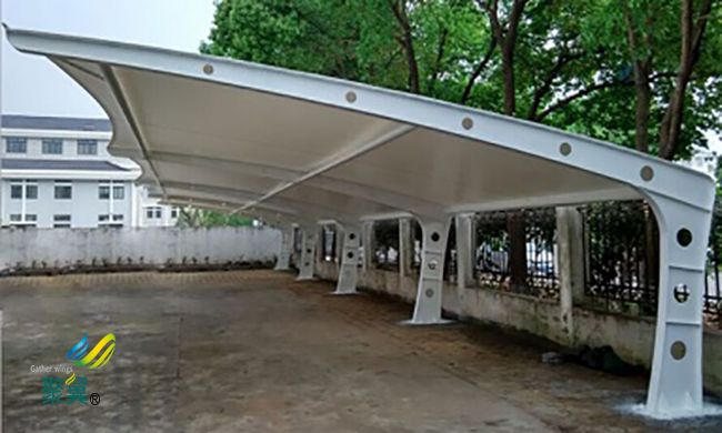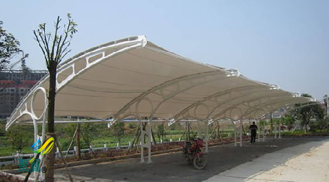 膜結構車棚耐溫性的特點,膜結構車棚既使在-40.C—+120.C的溫度之間也不會引起變形等質變的情況。