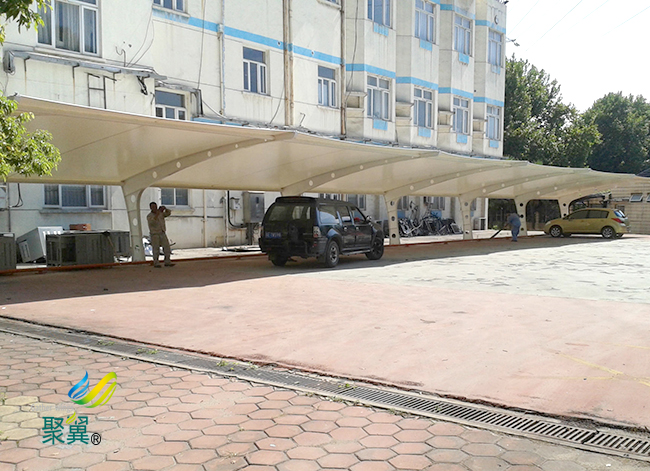 Teflon材料強度高、 膜結構車棚彈性模量大、自潔、耐久耐火等性能好,但它價格較貴,不易折疊,對裁剪制作精度要求較高, 膜結構車棚壽命一般在30年以上,適用于永久建筑。