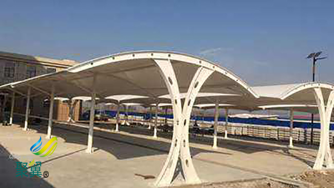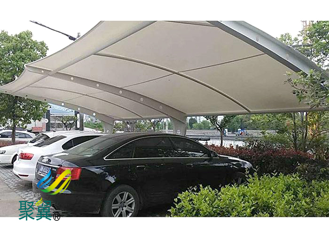 經濟性,由于膜結構車棚膜材具有一定的透光率,白天可減少照明強度和時間,能很好地節約能源。同時夜間彩燈透射形成的絢爛景觀也能達到很好的廣告宣傳效益。膜結構車棚膜建筑屋面重量僅為常規鋼屋面的1/30,這就降低了墻體和基礎的造價。