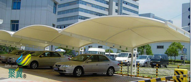 膜結構車棚自潔性。膜結構建筑在設計的時候本身外層具有一定的防護涂層,這種涂層帶有很好的自身清潔的作用,可以有效延長膜結構車棚的使用壽命。