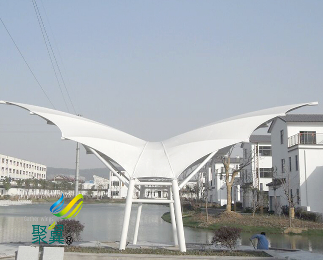 膜結構車棚材料選用了進口結構建筑材料,車棚骨架,表面處理采用進口船用底漆,炳烯酸聚氨酯面漆。由于高強度的 膜結構車棚膜材出現,再加上張拉技術的應用,使膜結構車棚抵御風雨的能力是一般雨蓬之類不可比擬的。有的車棚采用永久性膜材,可使用三、四十年。特別是遇到劇烈的暴風雨天氣, 膜結構車棚建筑巍然不動,毫發不損。