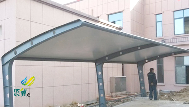 膜結構車棚所用膜材料由基布和涂層兩部分組成.基布主要采用聚酯纖維和玻璃纖維材料;涂層材料主要聚氯乙烯和聚四氟乙烯。Teflon材料強度高、彈性模量大、 膜結構車棚自潔、耐久耐火等性能好,但它價格較貴,不易折疊,對裁剪制作精度要求較高,壽命一般在30年以上,適用于永久建筑。