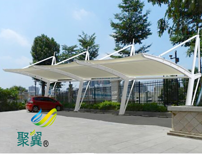 膜結構車棚整體框架采用方鋼焊接成型龍骨架,框架整體做防銹處理,刷防銹底漆三遍,表面噴涂白色汽車漆,膜結構車棚主立柱一般采用220mm鋼管或工字鋼作停車棚的支撐柱,膜結構車棚身整體結構牢固抗震防風系數(shù)高,耐腐蝕。