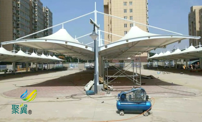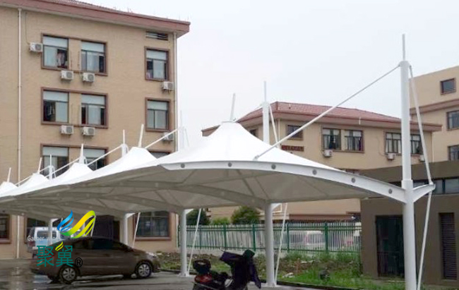 膜結(jié)構(gòu)車棚耐用:公共自行車棚屬于棚外基礎(chǔ)建設(shè),風(fēng)吹雨打是避免不了的。而膜結(jié)構(gòu)車棚膜材料具有高強度的特點,再加上張拉技術(shù)的應(yīng)用,根據(jù)力學(xué)原因構(gòu)造外圍,使得膜結(jié)構(gòu)車棚自行車車棚的支撐力和強度遠(yuǎn)遠(yuǎn)高于其他材料。