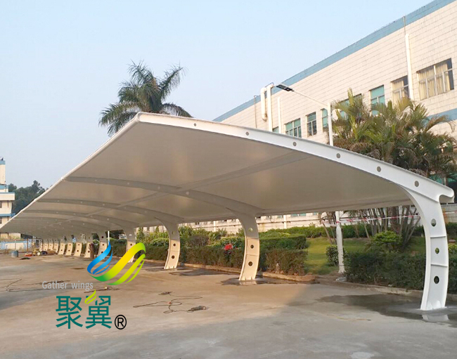 膜結(jié)構(gòu)車棚大跨度使用。這種屋頂膜結(jié)構(gòu)在克服傳統(tǒng)膜結(jié)構(gòu)自重大的基礎(chǔ)上可以應(yīng)用于大跨度建設(shè)的工程。因此,膜結(jié)構(gòu)車棚能創(chuàng)建更加廣闊的視覺空間,極大地提高了空間的有效面積。