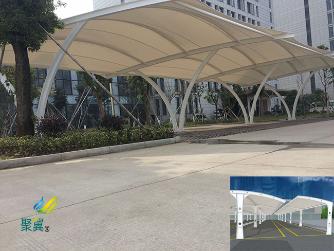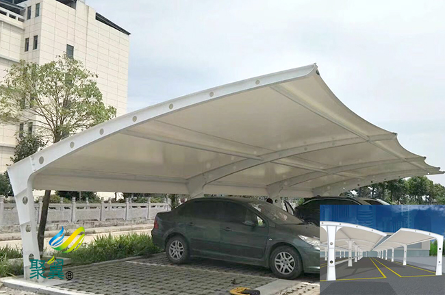 膜結構車棚的強度高,重量很輕,跨度也是很大的。這種結構所采用的材料是一種強度很高的織物材料,縱橫交織,采用的是雙面涂層。膜結構車棚耐用性很強,并且可以使用10年左右,重量是很輕的,大大低于膜結構車棚鋼結構的重量,在很大程度上可以滿足人們對大跨度的需求。